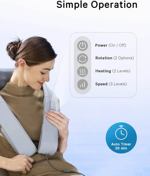 这款全新设计的颈肩揉捏按摩披肩,采用符合人体工学U形设计,搭配亲肤面料,为肩颈部提供如拥抱般极度舒适的按摩体验,内置4个按摩头,模拟按摩师人手揉捏按摩,3档强度可调,可双向按摩,还具有2挡红外加热功能,促进血液循环,不仅可以按摩颈部、腰部、肩部这三个身体部位,还能按摩腹部、臀部、背部、大腿、小腿、胳膊、手等部位,使用时,根据需要将它置于相应的身体部位即可享受按摩。臂带长度可根据需要调节长短,满足全家人需要。配送家用及车载电源,随时随地都可以使用。