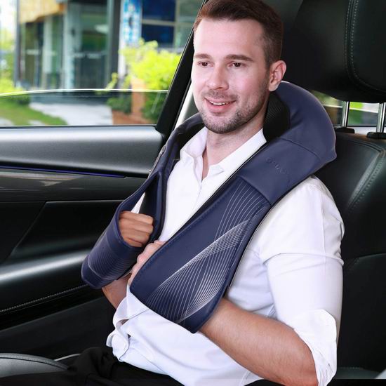 身体疲劳有压力,办公室久坐,有规律的按摩一下,可以有效缓解酸痛,提高精神状态。此款按摩披肩内置8个3D深度按摩头,符合人体工程学的U形设计,模拟人手揉捏按摩,3档强度可调,可双向按摩,还具有红外加热功能,促进血液循环,不仅可以按摩颈部、腰部、肩部这三个身体部位,还能按摩腹部、臀部、背部、大腿、小腿、胳膊、手等部位,使用时,根据需要将它置于相应的身体部位即可享受按摩。臂带长度可根据需要调节长短,满足全家人需要。配送家用及车载电源,随时随地都可以使用。