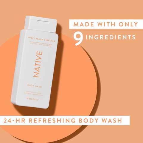 Native 甜桃花蜜沐浴露(532 毫升)以植物萃取与天然成分为基础,泡沫丰富细腻,清洁后不粘腻、不残留,令肌肤柔软水润。配方不含对羟基苯甲酸酯、邻苯二甲酸酯、硫酸盐表面活性剂和染料,更添加柠檬酸帮助温和调节肌肤 pH 值,带来舒适清新的沐浴体验。