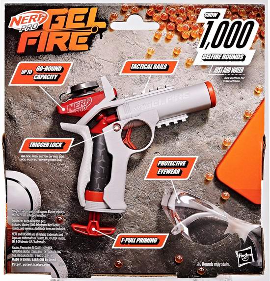 这款玩具枪发射的水合弹丸会在撞击时爆裂,带来强劲的爆炸威力,助您在游戏中占据优势。每次可发射1发凝胶弹,初速为每秒150英尺。套装包含NERF PRO脱水凝胶弹,加水后即可使柔软的超强吸水性聚合物弹丸吸水膨胀。附送护目镜,适合14岁及以上玩家。