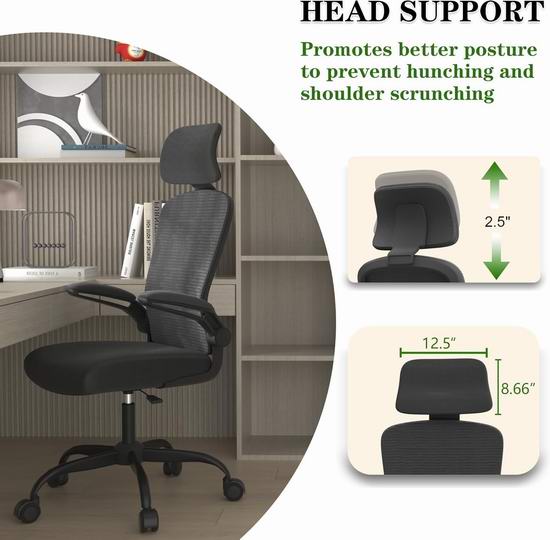 这款办公椅符合人体工学设计,高密度泡沫座垫提供稳固而舒适的支撑,有效缓解臀部和大腿的压力,并持久保持形状。可调节的腰部支撑贴合脊柱自然曲线,缓解下背部紧张;高度可调节的头枕支撑颈部和肩部,帮助减少疲劳,改善全天坐姿。拥有4英寸的座椅高度调节范围、2.5英寸的头枕行程调节范围和2.5英寸的腰部支撑调节范围,能够轻松贴合您的身形。采用加固钢底座和重型脚轮,承重高达150公斤,并经过严格测试,确保其长期性能。