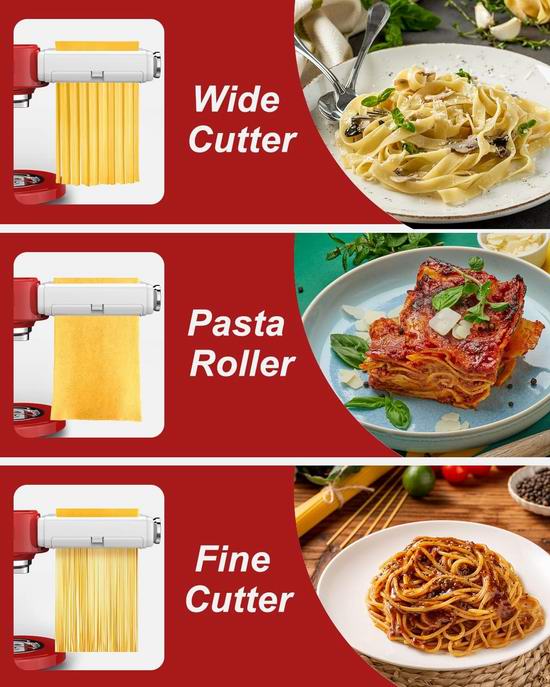 • 3合1功能:包括面条面团滚筒、意大利宽面条切割器和意大利面条切割器,轻松连接到 KitchenAid 立式搅拌机,实现多功能面条制作。