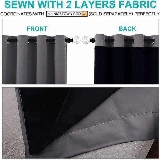 采用三重编织高密度聚酯面料,顺滑柔软,重型黑色背衬,可有效隔绝阳光,降低高达30分贝室外噪音,并减少热损失,窗帘宽度为52英寸,高度95英寸,可冷水机洗,晾干。