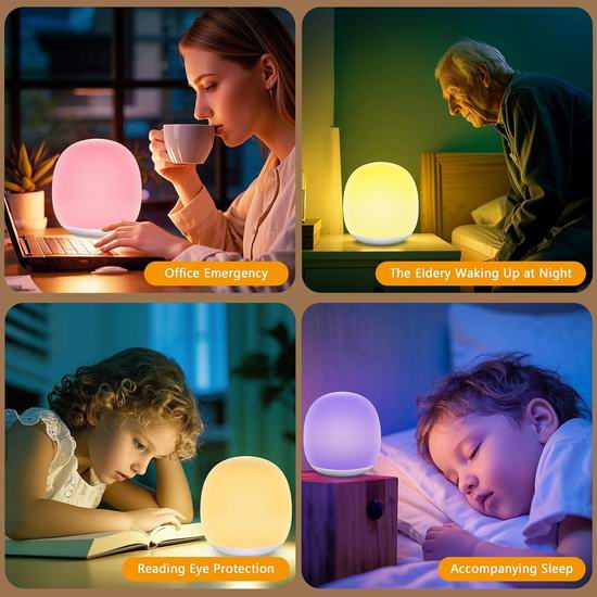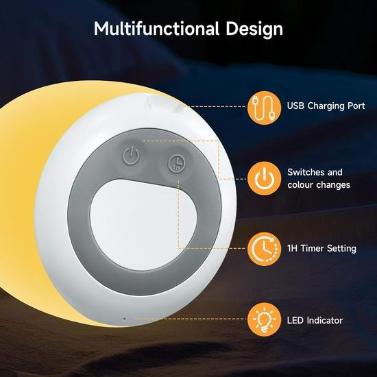 这款夜灯采用柔软的硅胶制成,不含BPA,可发出温暖柔和的光线,不刺眼。长按可调亮度,双击开关灯,单击即切换颜色。底部设有1小时定时按钮,1小时无操作后,设备将自动关闭。内置高容量电池,在强光模式下,续航长达5小时。