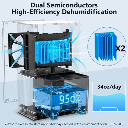 这款高效除湿机采用半导体冷凝技术,适用于卧室、储藏室、浴室、衣柜和大篷车,能有效将湿度保持在45%以下,去除空气中的水分。