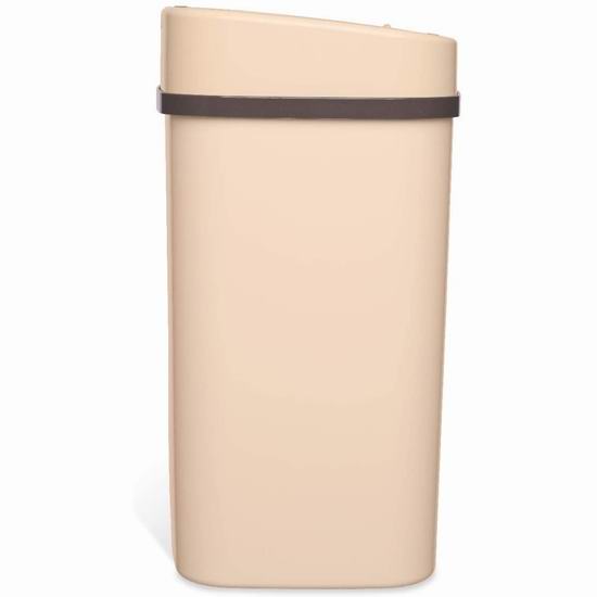 采用圆滑的ABS塑胶时尚外壳,整洁美观时尚,内置先进的红外传感器,当手移至感应区(10英寸)内自动打开,移开后3秒钟自动关闭,良好的避免了手与垃圾桶之间的细菌交叉污染接触,密封性能好,避免垃圾异味涌出。容量12升,外形尺寸为35.5 x 25.6 x 19.3厘米。
