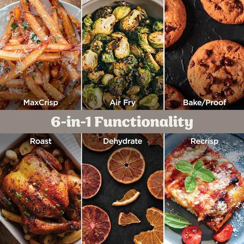 采用模块化底座设计,配备6夸脱与2.5夸脱耐热冲击玻璃容器、储物盖及脆皮盘,无毒材质可安全用于备餐、微波、冰箱及洗碗机。1800瓦强劲功率可烹饪7.5磅整鸡,满足10人份量,支持极致酥脆、空气炸、烘焙/发酵、烤制、再次酥脆和脱水六种功能,轻松处理带骨食材,适配多容量满足日常或家庭用餐需求。