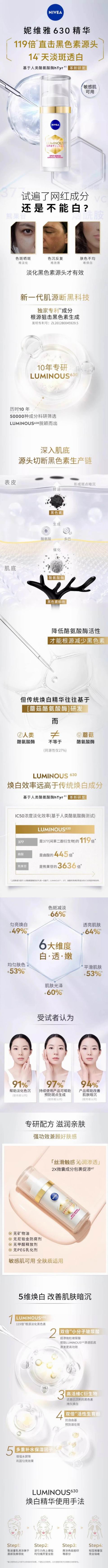 这款LUMINOUS630密集淡斑精华,主打集中淡化色斑沉积,添加专利的LUMINOUS 630配方,核心成分是拜尔斯道夫专利的肽安密多(Thiamidol),目前最强效的间苯二酚类成分,对酪氨酸酶活性的抑制有显著的效果,源头减少黑色素产生,联合抗坏血酸磷酸酯钠(SAP)将游离黑色素还原,维生素E帮助预防色素沉积,以微分子透明质酸加速LUMINOUS 630渗透起效,全程阻止肤色加深和斑点形成。这款精华在国内的版本采用了双管分离包装设计,保湿力和修护抗老方面则是海外版更出色。