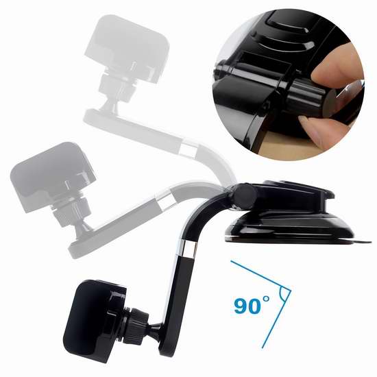 吸盘可牢固固定于挡风玻璃,支座可360度旋转,并任意调整角度,适用于6英寸以内的手机或GPS导航设备。