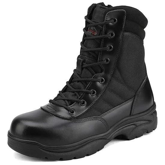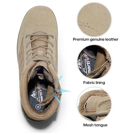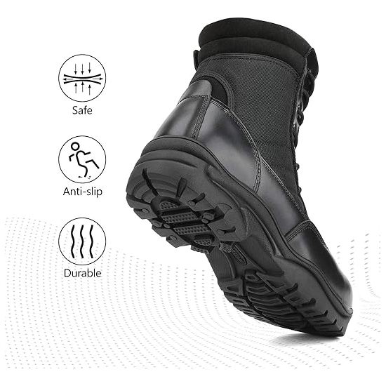 耐用且防护性强:这款工作靴鞋面采用优质皮革和织物拼接而成,经久耐用。钢制鞋头符合 ASTM 2413-18 标准,防穿刺中底和高筒靴设计提供全面防护和脚踝支撑。透气面料保持双脚干爽舒适。可拆卸的减震鞋垫提供全天候的支撑和舒适感。橡胶外底,在各种地形上都能提供良好的抓地力。在建筑、焊接、仓库、屋顶作业、骑摩托车等场合表现出色。侧拉链和系带双重闭合设计,方便快速穿脱。