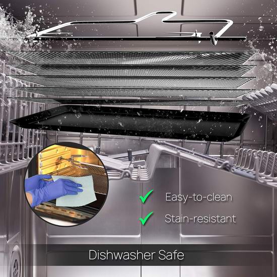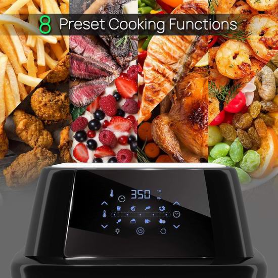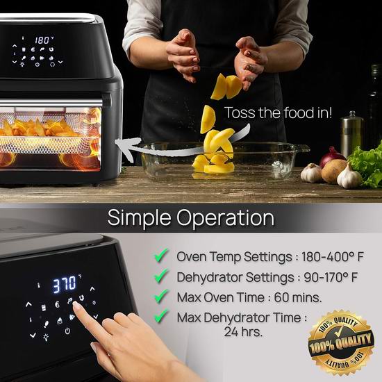 这款多功能空气炸烤箱配备一个 4.2+ 夸脱的大容量滑出式炸篮,总容量为17+夸脱,足够为全家人烹制美味又健康的食谱。可用作无油空气炸烤箱,烹饪美味低脂食物,并配有滴油盘、烤串和叉子,还可用作旋转烤炉。此外,包含多层脱水托盘/架,可用作食物脱水机。配备数字液晶显示屏和触摸按钮控制,内置8种预设烹饪模式。具有可调节的时间/温度设置,以及方便取用的带烤箱灯的玻璃门,让您轻松准备食物。