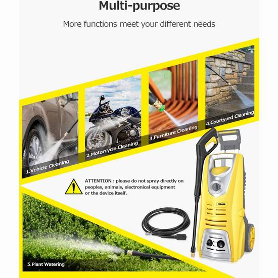 此款高压清洗机能提供高达3046 PSI水压,1.85 GPM耗水量,通过ETL认证,足够让户外晒得发黑的木板,长满青苔的红砖变成新的一样,可清洗家居、庭院、汽车、船舶等,具有1800瓦/15安培大功率无刷感应电机,含5个喷嘴(0°,15°,25°,40°和皂液),电源线长达35英尺,提供强大动力和高水压清洗能力。