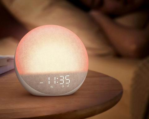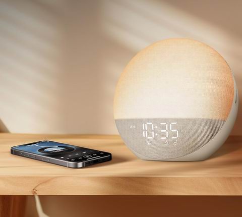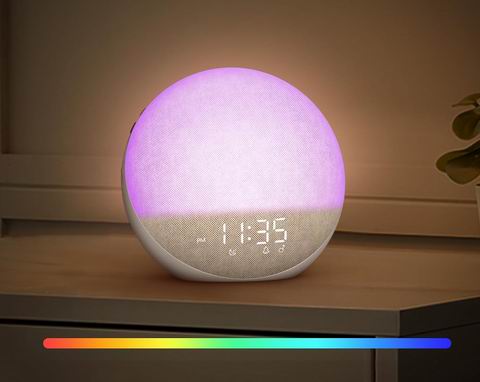 这款日出闹钟白噪音机集闹钟、助眠灯和蓝牙音箱于一体,模拟自然日出,在设定时间前逐渐亮光,轻柔唤醒身体。内置25种白噪音与自然音效,助您放松入睡。配备5W立体声蓝牙音箱,可播放音乐或播客;数字时钟亮度0–100%可调,提供12种柔光夜灯颜色。支持7种闹铃声与三种唤醒模式,操作简便,无需App,是营造舒适睡眠环境的理想选择。