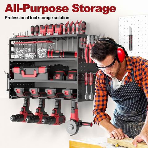这款电动工具壁挂式收纳架采用4孔钻架设计,配备3层结构层架、侧边挂板和多个挂钩,可有序收纳充电工具及小配件,充分利用墙面空间。它由重型钢材制成,表面涂有防锈涂层,承重能力强,单个挂架可承受超过200磅重量。安装简便,几分钟即可完成组装。黑色外观简洁大方,适用于车库、仓库、工作室等多种场景,帮助打造整洁高效的工具存放环境。