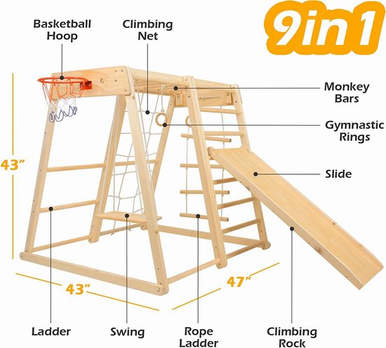 采用天然松木材质,无害涂料,材料通过CE和CPC认证,提供室内丛林健身房,爬坡,滑梯,秋千,几何圆顶,猴子吧,攀岩墙和瑞典绳梯等多种功能,陪伴1.5-6岁的孩子成长,适用于家庭室内和室外使用。