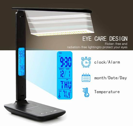 这是一款非常实用的多功能护眼台灯,具有台灯、无线充电、USB有线充电、时钟、闹钟、日历、温度计、色温调节、手机座等9大功能,灯光无闪烁,无暗区,无重影,接近自然光,保护你的视力,并减少眼睛疲劳,5级亮度+3档色温调节,满足不同照明需求。配备高清液晶屏幕,可显示时间、日期、温度和闹钟等信息。底座配备USB充电口,内置10W无线充电板,可为支持QI无线充电的设备进行充电。
