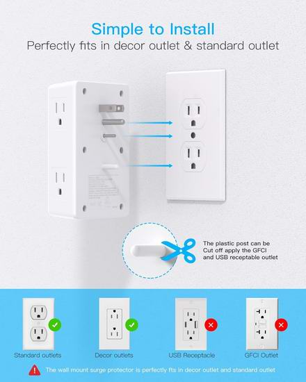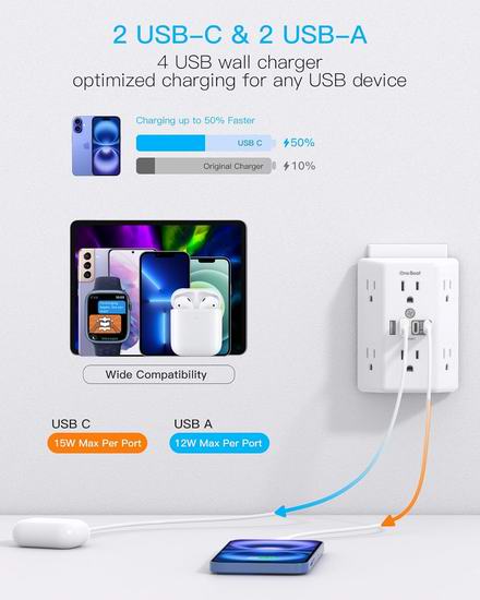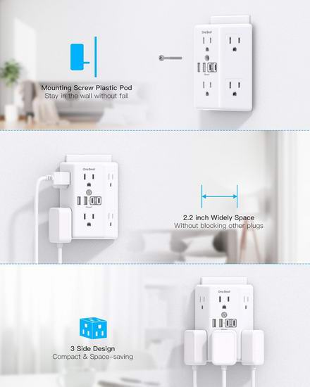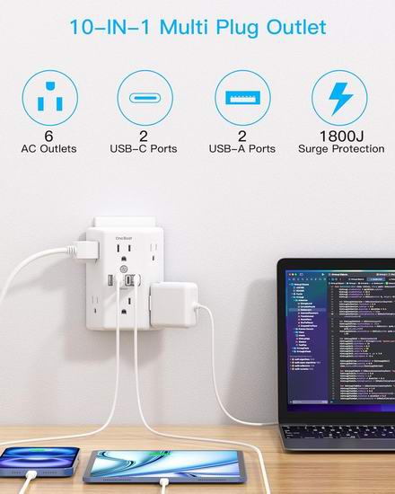 历史新低!One Beat 6插座 + 4 USB充电口 电涌保护 墙插 壁式插线板5折 10.99加元!