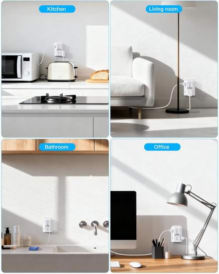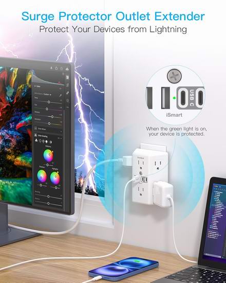 独特的三面设计,配备6个交流电源插座和4个USB接口(其中2个USB-C接口),单侧插座间距达2.1英寸,可同时为5个大插头充电而不堵塞。内置1800焦耳浪涌保护器,满足您的大部分生活需求,支持多个设备同时充电。内置1800J浪涌保护器,采用三重互补浪涌保护电路:瞬态电压抑制器(TVS)、金属氧化物压敏电阻(MOV)和气体放电管(GDT),并结合耐火外壳(耐火温度高达1382℉),全方位保护您和您的设备安全。通过 ETL、ROHS 和 FCC 认证,可防止您的电器设备过流、过充、短路和过热。