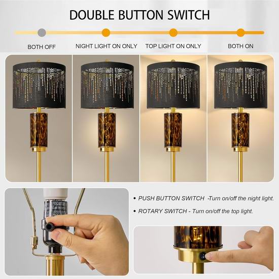 这款落地灯采用复古设计,时尚设计灯罩,配有LED玻璃夜灯,主灯和夜灯可独立控制,满足不同照明需求。内置灯泡无频闪、无眩光,柔和的光线有效保护视力。落地灯高161厘米,夜灯位于127厘米高度,可用于客厅、卧室、书房、餐厅、沙发旁以及任何需要照明的房间。
