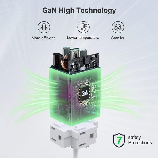 此款充电器采用氮化镓 (GaN) 半导体充电技术,具有出色的散热和超高效充电性能,采用PD快充技术,充电功率高达65瓦,内置2个USB-C充电口和1个USB充电口,支持同时为笔记本电脑、平板、手机等设备快速充电,内置3个交流电插座口,额定功率1200瓦,具有多重保护功能,消除过充、短路、过流等问题。