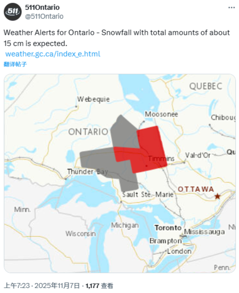虽然这波降雪主要影响北部地区,但对南部居民来说,也是一记明显的“冬季信号”。安省人口最密集的南部地区本周末气候仍相对温和,但未来几天的天气变化将提醒人们,冬天的脚步正在逼近。