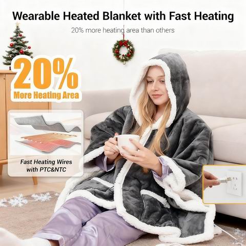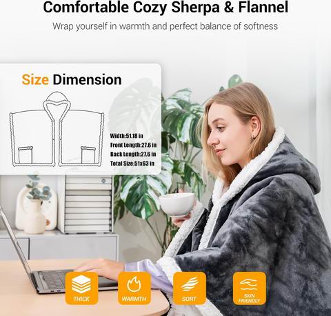 女士可穿戴加热毯(灰色,51×63英寸)采用100%聚酯纤维双面设计,外层200g/㎡法兰绒、内层200g/㎡羊羔绒,柔软保暖且耐用。支持9档温度调节(约86–122°F)与1–9小时定时功能,快速升温并配备过热保护,通过ETL和FCC认证,使用更安心;电源线长度约24+85英寸,活动更灵活。披肩斗篷式设计配双扣袖口与可调节斜扣领口,带双口袋,可覆盖全身,适合居家、办公室、沙发或床上使用。控制器可拆卸,支持机洗(冷水洗涤,勿熨烫),清洁便捷,是冬季居家或节日送礼的实用之选。