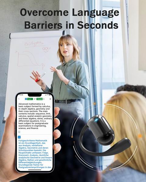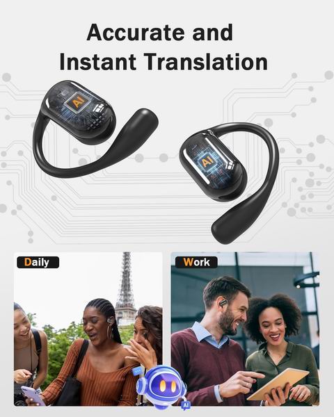 这款开放式 AI 翻译耳机主打搭配 APP 的实时翻译,支持 134 种语言并提供多种翻译/通话模式(如 AI 聊天、自由通话、耳机与通话模式等),宣称翻译准确率可达 98%,适用于旅行、商务与学习场景;开放式轻量设计相对更适合长时间佩戴,单次续航约 8 小时、配充电盒总续航约 40 小时,约 2 小时可充满;同时配备 14.2mm 动圈单元与降噪麦克风,强调立体声听感与更清晰的通话拾音。