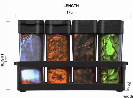 这款调料罐套装采用不含BPA透明塑料材质,小巧便携,配有密封盖,确保安全存放香料,让所有香料触手可及,井然有序。单个容器尺寸为9.5 x 5 x 3.5厘米。