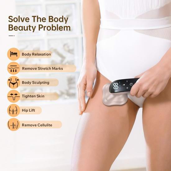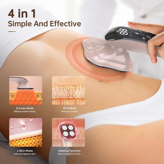 这款按摩器采用升级版4个按摩头,增加了与皮肤的接触面积,具有3种按摩模式和10级力度选择,适用于手臂、腹部、背部、腰部、腿部和臀部等身体各处部位。按摩器采用无线设计,方便随时随地按摩。具有加热功能,加热范围37-42°C,可增强按摩效果,促进血液循环。注意:请勿将本产品用于面部和颈部。首次使用时,请从最低档位开始。如果皮肤感到不适,请调低档位。