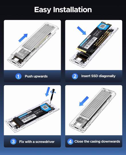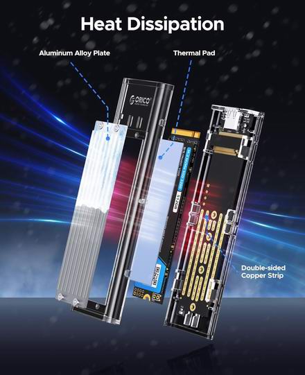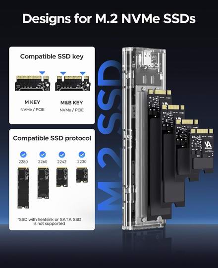 基于 JMS583 高速 10Gbps 主控芯片,支持 NVMe M-KEY M.2 PCI-E SSD。滑动式闭合设计,螺丝固定安装方式,兼容性强,支持 UASP TRIM 协议。具备 10 分钟智能休眠功能,散热性能出色,有效延长 SSD 使用寿命。支持USB 3.1 Gen2 超高速10Gbps,低延迟,节能高效。两种线缆,扩展兼容性:C-to-A接口(5Gbps)适用于PC;10Gb/s C-to-C接口适用于笔记本电脑和C系列手机。双面铜条多孔散热,散热稳定;集成硅散热,散热迅速;精细铝合金线条设计,导热性能更佳。三重散热,快速冷却。内置LED显示屏,运行状态清晰可见。仅支持 M.2 M KEY SSD(NVME 协议),规格为 2280、2260、2242、2230。