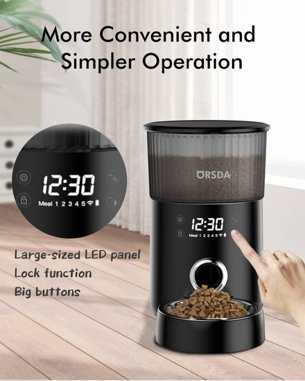 这款全自动宠物喂食器,配备大尺寸LED屏幕,轻松掌握喂食器的运行状态,并可以个性化定制每餐的喂食时间和份量,每天可喂食1-5餐,支持直径5-15毫米的干粮。专利转子设计,内置红外线感应器,可在食盆满时,或宠物未按时食用时自动停止喂食。内置麦克风和扬声器,可以录制主人召唤宠物进食的声音,让猫狗养成听到声音就来进食的习惯。支持双电源,需3节D号电池,可在停电时使用电池供电。