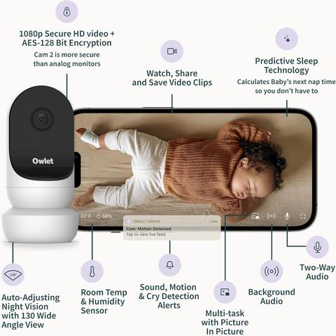 一款带摄像头与音频的视频婴儿监视器,提供 1080p 高清画面,支持夜视、广角视野与 4 倍变焦,方便家长昼夜清晰查看宝宝状态;可在 App 中查看宝宝房间的实时温度与湿度数据,帮助判断环境是否舒适、衣物是否需要调整;支持声音、动作与哭声提醒,并可回看触发提醒前后的短视频片段,便于识别宝宝的细微信号与作息规律;通过 Owlet Dream App 可手动记录睡眠事件并获得“预测睡眠”提示(与 Owlet Dream Sock 搭配可实现自动睡眠追踪);设备初次设置需手机/平板与 Owlet 设备连接 2.4GHz Wi-Fi;默认包含 48 小时免费视频片段存储,亦可在 App 内升级 Owlet360 获得最长 14 天存储。