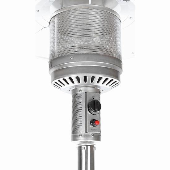 此款取暖器采用不锈钢结构,辐射加热技术,使用使用标准20磅丙烷燃气罐,位于杆顶部的燃烧器可产生高达46,000 BTU热量,是寒冷季节户外及庭院取暖不可缺少的器具。配备小轮子,便于移动。