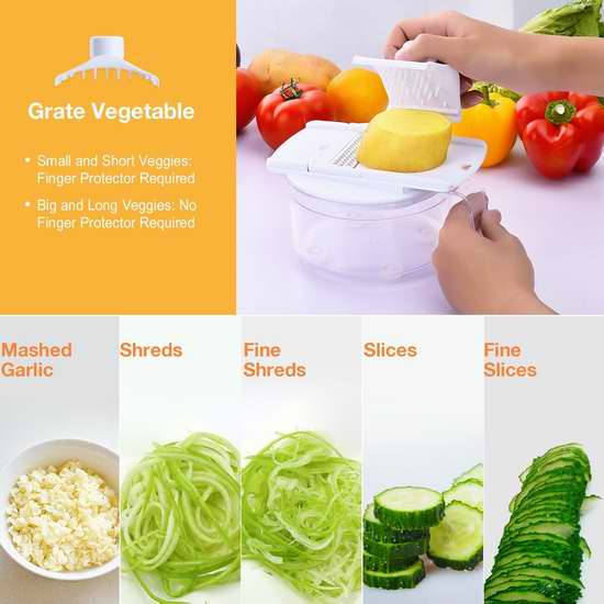 此款多功能切菜机无需电力,能够快速将瓜果蔬菜切碎、切条、切丝或切片,还可以榨取橙汁、柠檬汁,省时又省力,不怕切到手啦。用来处理黄瓜、红薯、大蒜等各种蔬菜非常方便,厨房达人必备款哦。 只需简单地将蔬菜或水果放在尖头叉子上,转动手柄,即可将蔬菜或水果推向刀片,达到切割蔬菜或水果的目。