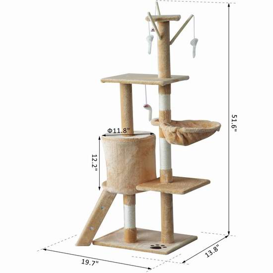 猫爬架满足猫咪喜欢待在高处,能看清周围环境的天性。由木头制作而成并覆盖人造毛皮,柱状结构则覆盖天然的草质麻绳,麻绳的气味可以让猫回归自然。这主要是为了吸引猫在上面磨爪,防止猫抓坏其它家中物品。这款带一个小型猫房间,一个猫窝,多层平台空间让喵星人呆得更舒适。外形尺寸为25.6"L x 19.7"W x 60.2"H。