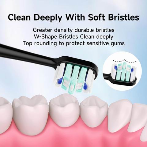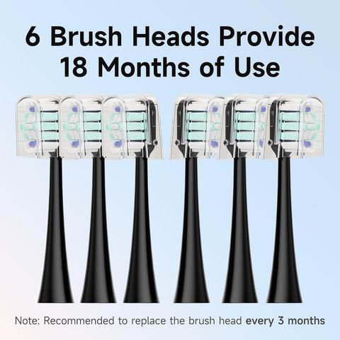 可充电声波电动牙刷,配备6个替换刷头和牙刷头,操作简便,能深层清洁牙缝中的食物残渣、细菌和牙垢等,同时按摩牙龈,促进血液循环,缓解牙痛;还能有效去除牙齿表面色素,保持牙齿洁白洁净。一次充电可使用30天,IPX7级防水,5种模式如轻柔、清洁、美白、抛光和新手模式),3种强度(高、中、低),智能定时器,满足您的各种需求。牙刷开启按钮前有约3秒的缓冲时间,帮助您快速适应不同模式。