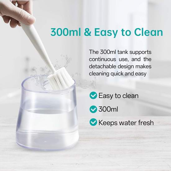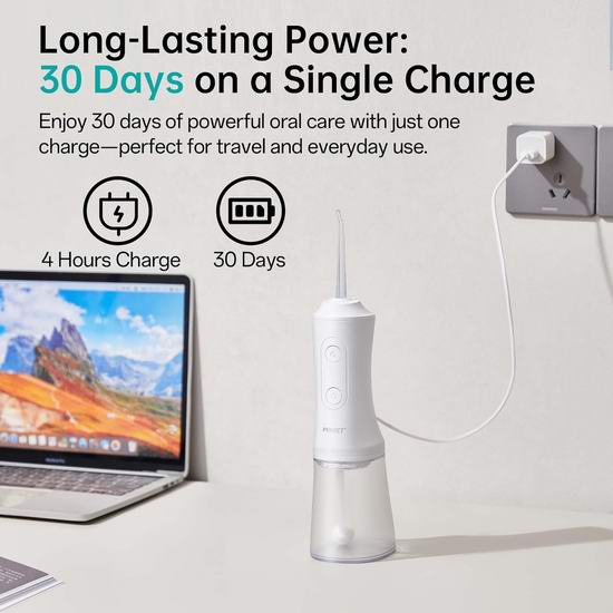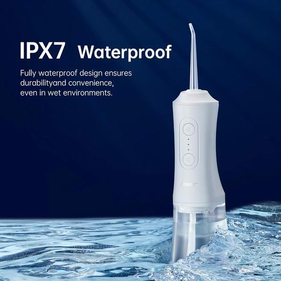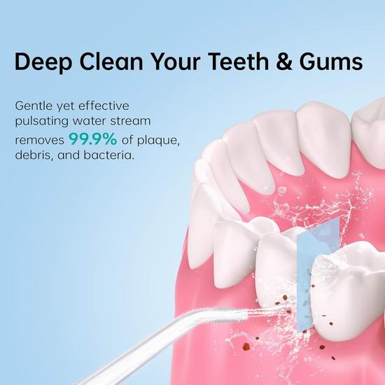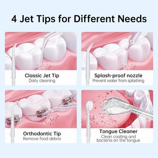 这款水牙线拥有专业级的口腔护理功能,60-120 PSI 的高压水脉冲(每分钟 1500 次)可有效去除顽固牙菌斑、食物残渣、扁桃体结石和细菌。尤其适合佩戴牙套和牙龈敏感人群,其清洁效果远胜传统牙线。具有三种模式:柔和、标准和脉冲,满足不同敏感度或深度清洁需求,配备四种可互换喷嘴(标准型、正畸型、牙周型和舌苔清洁型)。内置300毫升大容量可拆卸水箱,充满电后,可续航长达40天。IPX7级防水设计,让您在淋浴时也能安全使用。