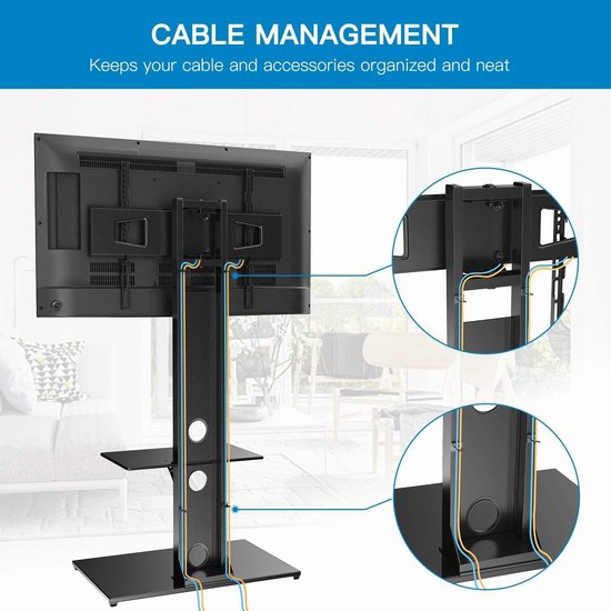 采用钢制结构+钢化玻璃底座,可稳定支撑37-75英寸的智能电视,最大承重99磅,电视具有3挡安装高度,可向左或向右旋转25°,以实现最佳观看角度。