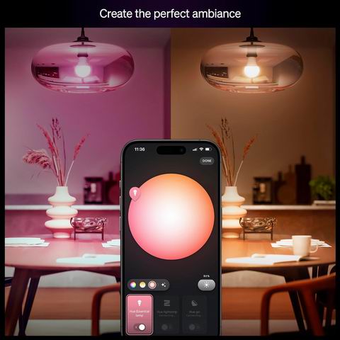 飞利浦 Hue Essential 入门套装包含 1 个 Hue 桥接器和 4 个 E26 白光 + 彩色智能灯泡,色温范围 2200K–6500K,支持数百万种颜色与可调光功能。通过 Hue 应用即可轻松安装桥接器和灯泡,并访问丰富的预设灯光场景库,包括节日主题与可自定义效果,轻松营造理想氛围。亮度可从全亮调节至 2%,满足阅读、休息等不同情境。连接 Alexa、Google Assistant、三星 SmartThings 或 Apple Home 后,还可通过语音随时控制照明,是打造智能家居的方便且灵活的入门套装。