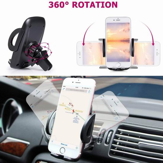 此款手机支架可夹在空调出风口处,360°旋转,可用于固定宽度4.8-9.4厘米的手机。