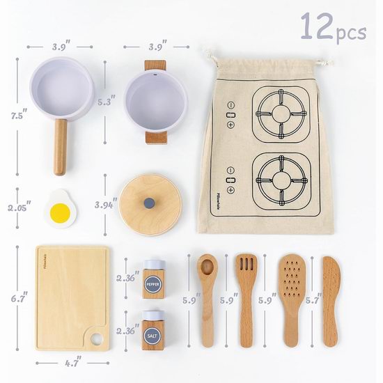 采用坚固的FSC山毛榉木,边缘光滑,经 ASTM/EN71 认证的无毒涂层,通过切菜、搅拌和调味,增强精细运动抓握、计数和角色扮演语言能力。套装包含锅、平底锅、锅盖、煎蛋片、刀、勺、锅铲、磨碎器、砧板、盐和胡椒瓶,以及一个可折叠成双头炉灶的棉布袋。