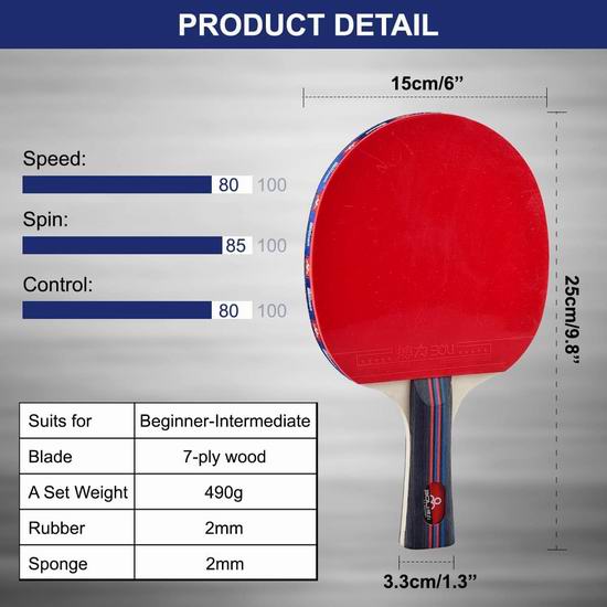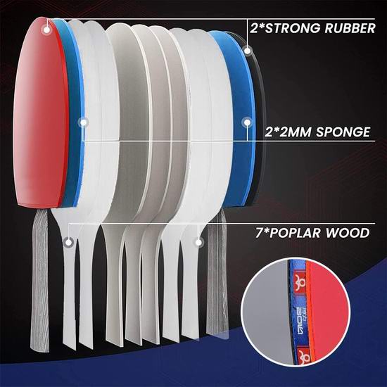 这款优质室内外乒乓球拍套装包含四支乒乓球拍和八个耐用乒乓球,让您尽享单人或团队比赛的乐趣。球拍采用7层底板,厚度为7毫米,搭配耐用橡胶,厚度适中,平衡性极佳,可提升球速、控制力和旋转。乒乓球重量适中,带来真正的专业体验,适合所有水平的选手,尤其在弧圈球方面更能助您一臂之力。手柄采用喇叭形设计(上窄下宽),不仅能提供更佳的握持感,还能兼顾足够的灵活性。多年来,喇叭形手柄设计一直是顶级球拍的首选。收纳袋可容纳所有配件,方便您携带乒乓球拍和球到任何地方,享受室内或室外专业或休闲的2-4人比赛。