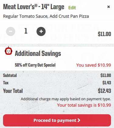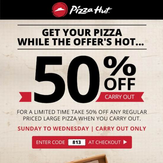Pizza Hut网店活动,每周日到周三期间,在网店下单订购大号正价披萨,使用折扣码:813 并选择店内自取,享受5折优惠,点击进入订购页面。