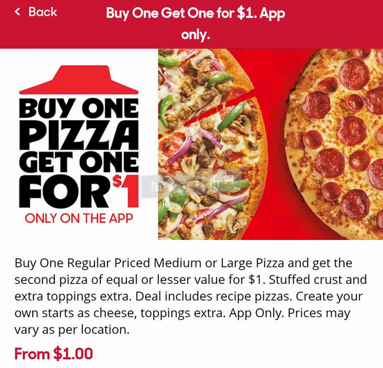 Pizza Hut网店活动,登陆官方APP下单,在活动页面购买中号或大号披萨,无需折扣码,第二件披萨(等价或低于第一件价值)仅需1加元,送货上门运费3.99加元起,店内取货免运费,点击进入订购页面(仅限APP,网店不参加)。