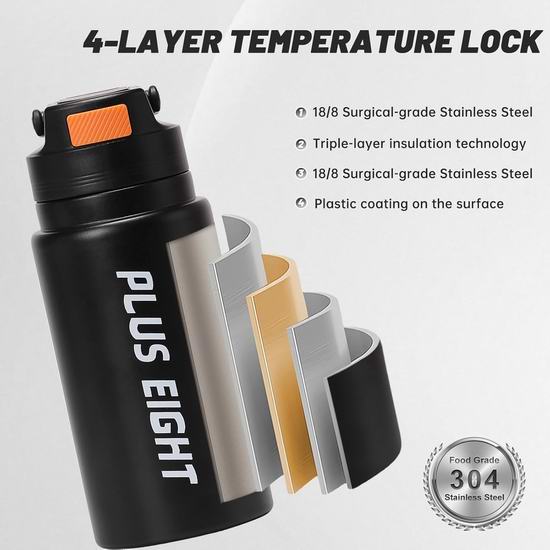 采用双层18/8不锈钢材质,不含BPA,无毒无害,可保温12小时,保冷24小时。宽口设计易于清洗,让您轻松快速地装入冰块或水果。吸管盖带有防尘盖,可在两次使用之间保持吸嘴清洁并盖好,同时还配有一个方便的小杠杆,可以轻松快速地翻开吸嘴,而无需用手指撬开。采用倾斜角度设计的自动翻转吸嘴盖,更适合单手饮用,吸嘴可使大量水流出而无需过大的吸水力。