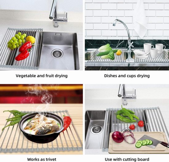 采用高品质不锈钢制作,不含BPA,FDA食品安全级防滑硅胶固定,美观卫生清洁,不会生锈,可平放在厨房水槽上(水槽宽度不超过16英寸),将洗好的蔬果或餐具放在上面,让其水分、水滴沥干,水槽的最佳拍档,厨房的好帮手,能真正给在厨房中辛勤忙碌的您带来便利。可承受204摄氏度(400华氏度)高温,可用于烤箱,也可以用作烘烤食品冷却架。整体可以卷起来存放,大大节省储存空间。展开后尺寸为16.9 x 11英寸。
