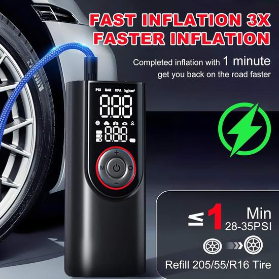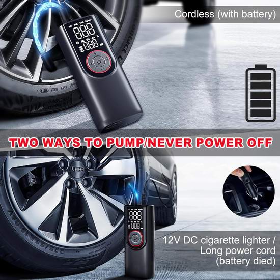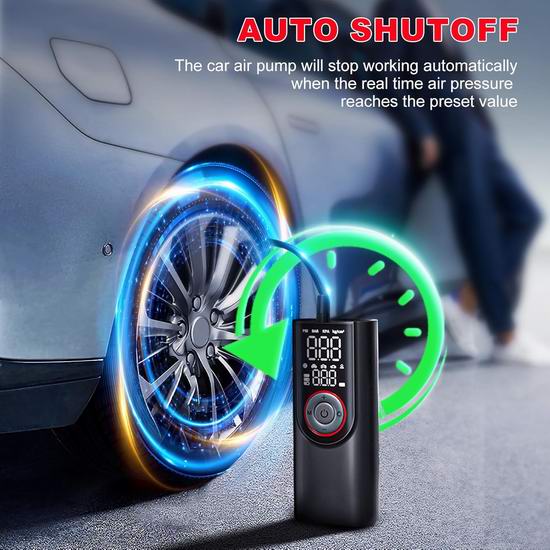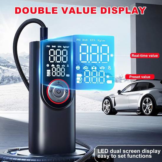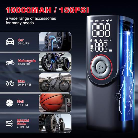 这款多用途电动充气泵适合放在车里当随车应急装备,也可以平时给自行车、摩托车、球类快速补气。内置 10000mAh 大容量电池,日常不用频繁充电。最大 150 PSI 压力配合更快的充气速度,给汽车轮胎从日常偏低胎压补到正常范围会更省时间;除了无线使用,还附带 12V 车载电源线,关键时刻就算电量不足,也能直接接车载电源继续充气。预设了汽车、自行车、摩托车、球类和自定义五种模式,双屏显示能同时看到实时胎压和目标胎压,达到设定值后会自动停机,能省去反复盯着看的麻烦,也减少过充风险。内置 LED 照明,还可以当充电宝应急使用。