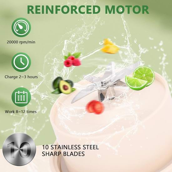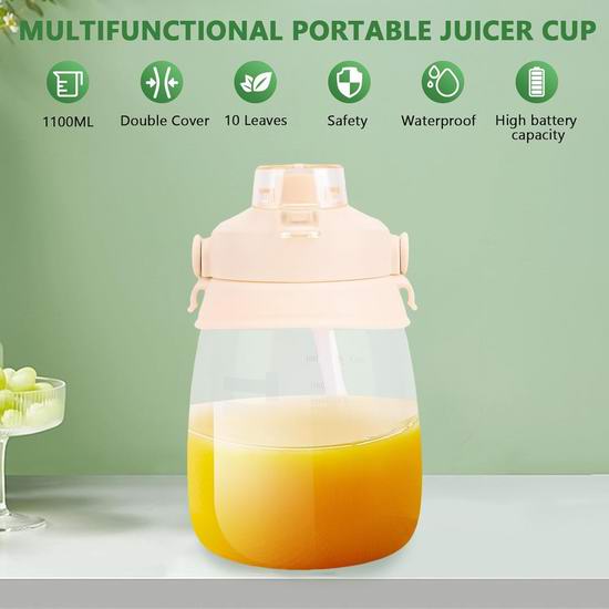 出门在外也能轻松喝上新鲜果汁啦~这款便携式榨汁搅拌机,小巧可爱又超实用,具有1.1升大容量,不仅能榨果汁、做奶昔、冰沙,连蛋白奶昔都能轻松搞定!杯身采用ABS和PC健康材质,冷热皆宜,安全可靠。搭载强力电机,转速高达 20000 转/分钟,内置10片刀头,榨汁更快更细腻。双盖二合一设计,不仅可搅拌,还能变身随行水杯,一杯多用!内置1500mAh电池,充满电后可搅拌8-12次。