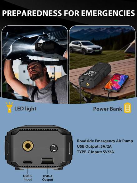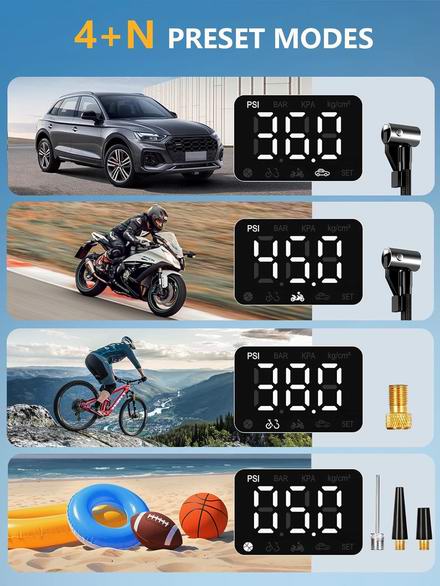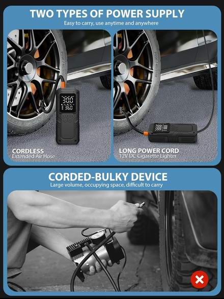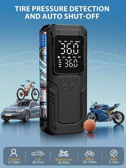 这款无线汽车轮胎充气泵搭载强劲电机,充气速度提升5倍,仅需50秒即可将195/65/R15轮胎的气压从29 PSI充至36 PSI。配备高精度压力表,可实时监测胎压,确保行车安全。内置6000mAh电池,一次充电即可为20个汽车轮胎或38个自行车轮胎充气。电量不足时,只需切换到 12V 直流电源接口,即可作为您的随身备用电源。配备精准液晶显示屏,可实时显示轮胎气压。只需设定目标PSI值,车载气泵即可在达到预设压力时自动停止,有效防止过度充气。具有4种预设模式,可为汽车、摩托车、自行车、房车和球类充气。还可用作自行车气泵,配备 4 个气嘴和一个带压力表的充气头,可实现快速、精准的充气。内置高亮度LED手电筒,并可兼作USB输出移动电源,让您在路边紧急情况或露营旅行中持续为手机充电。