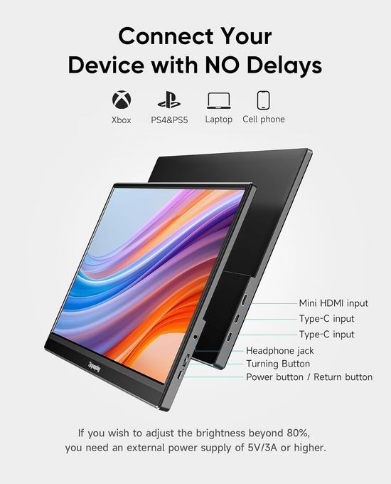 这款便携式笔记本电脑显示器配备全高清1080P IPS显示屏,呈现清晰锐利的画面和鲜艳的色彩。HDR支持进一步提升您的观看体验,使色彩更加鲜艳夺目,对比度更加突出。无论您是在进行设计工作、观看电影还是玩游戏,这款显示器都能始终呈现清晰的图像和鲜艳的色彩。无需复杂设置,即插即用,接入笔记本电脑可立即连接作为第二屏幕。显示器仅重1.4磅,厚度仅0.3英寸,可轻松放入笔记本电脑包中。显示器配备坚固的支架,可让您调节角度,获得舒适的观看体验。可与多种设备配合使用,包括 Windows 笔记本电脑、Mac、Chromebook、PS4/5 和 Xbox。它支持 Windows、Android 和 macOS 系统,包括搭载 M1、M2 和 M3 芯片的 Mac。